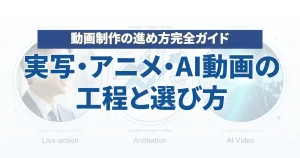 動画制作の進め方を、実写・アニメ・AI動画のパターンで横並びに整理。費用・期間・向いている用途の比較から、問い合わせ〜納...