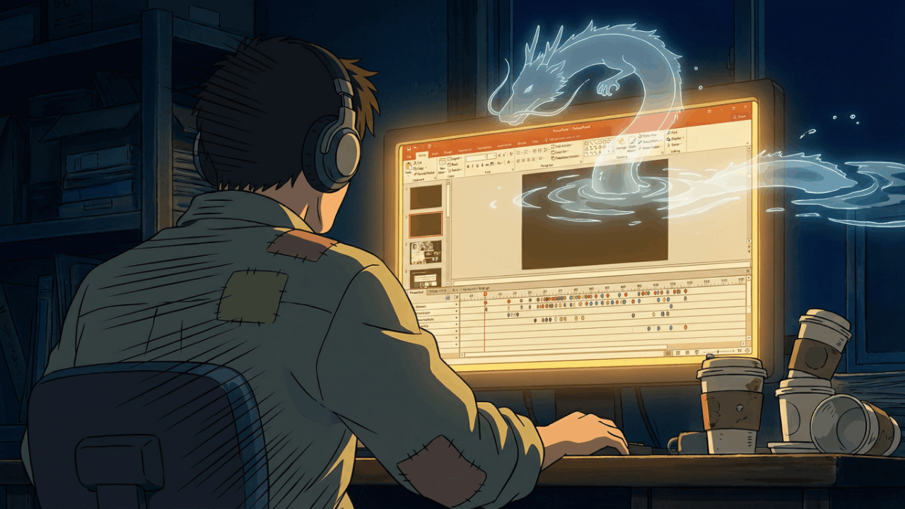 深夜の作業部屋で職人キャラクターが大型モニターに向かっている斜め後ろ姿。画面にはアニメーション設定がびっしり並び、モニターの上部から光とともに芸術的な映像(竜のシルエット、水の揺らめき)が溢れ出している。