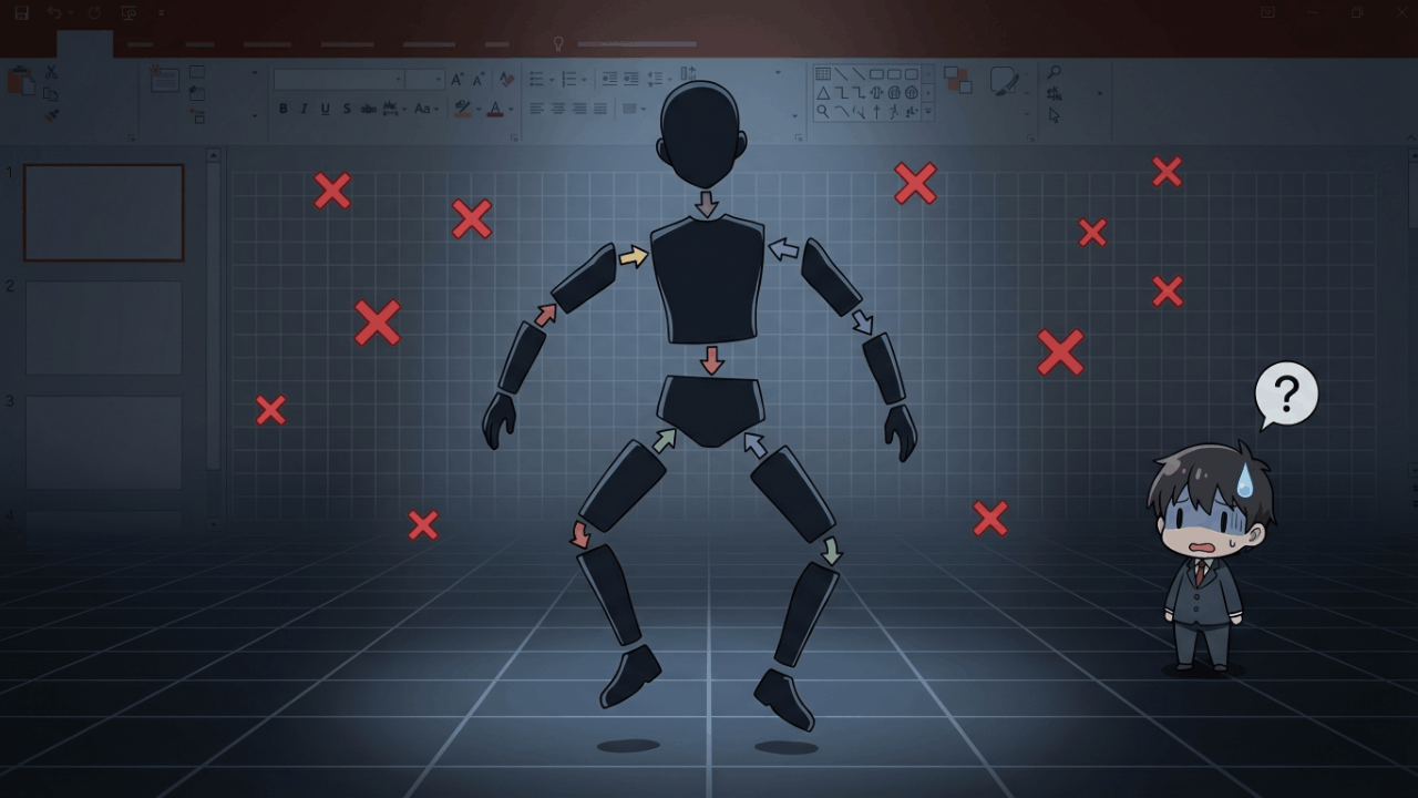 パワーポイントの画面上でキャラクターの手足パーツが7コマに分解されてバラバラに浮いている。関節の支点がずれてうまくつながらず、キャラクターが困った表情で「?」の吹き出し。パズルが合わない焦りの構図。