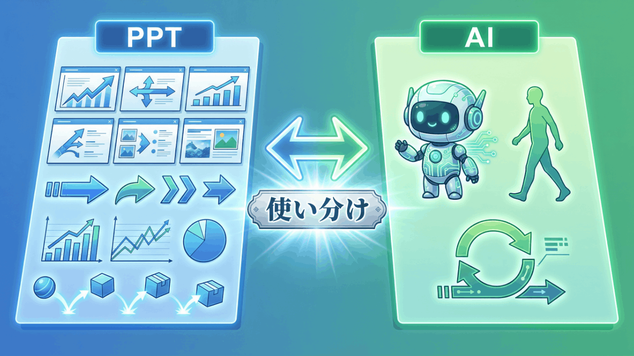 左右2分割の対比構図。左にPPTの図解・グラフ・矢印アニメーション群、右にAIの動くキャラクター・ループ動画アイコン群。中央に「使い分け」の両矢印プレート。どちらも輝いていて優劣なくチームとして機能している印象。