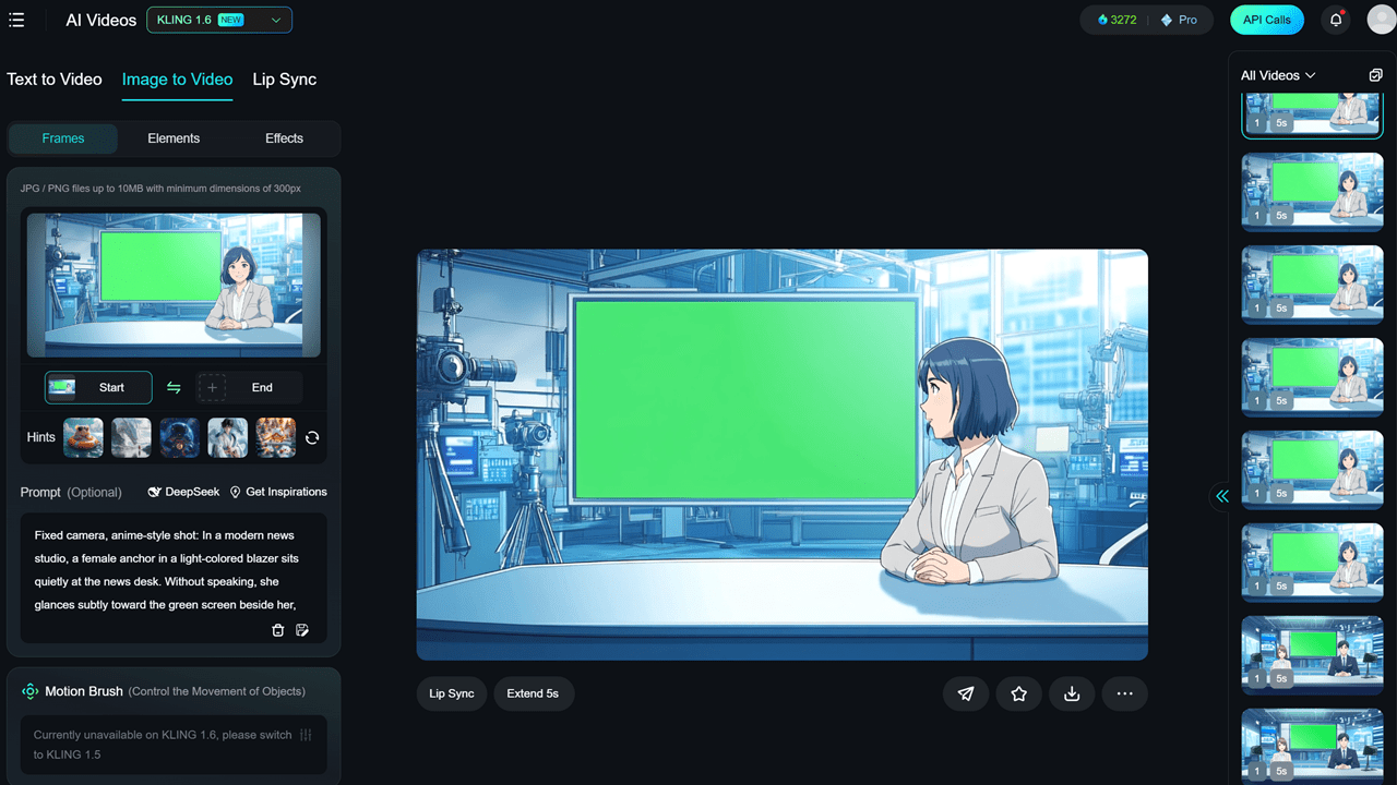 今回はMidjourneyで画像生成した後、KLINGという動画生成AIにより女性キャスターの動きを生成しています。様々な動画生成AIが台頭してきていますが、KLINGはアニメテイストの画像からも比較的安定した生成結果を得られることから、こちらで出力する機会が増えています。Runway等も活用していますが、KLINGは中国製のAIということもあってかプロンプトで「お辞儀」や「身振り」といったボディランゲージのニュアンスが伝わりやすいという点や、英語よりも中国語に翻訳してからプロンプトを入れると精度があがることがあるということもあって使い勝手がよいと感じています。今回も英語と中国語を駆使しながら動画を生成しています。