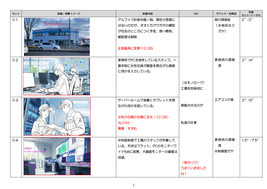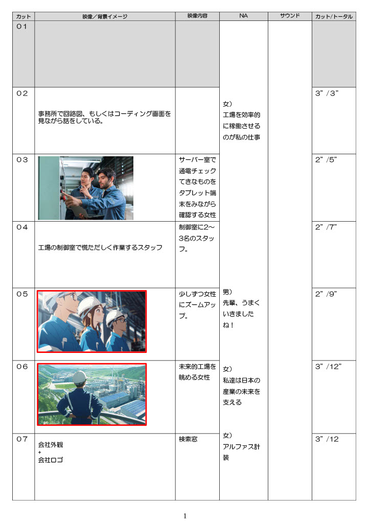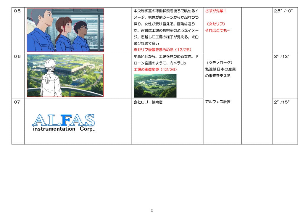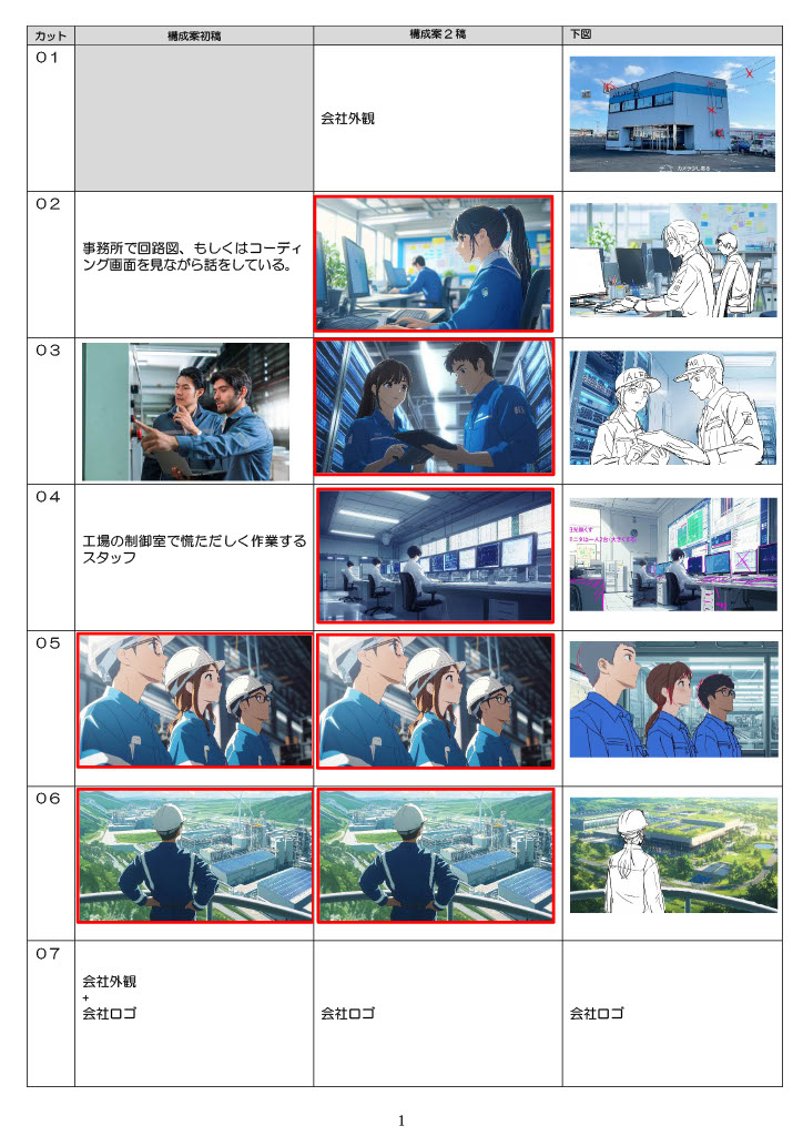 構成案の初稿は、着手日当日中に提出。この段階で、カット5・カット6の構図とカメラワークが決定しました。コンテの赤囲みをしたグラフィックが生成AIによる出力画像です。