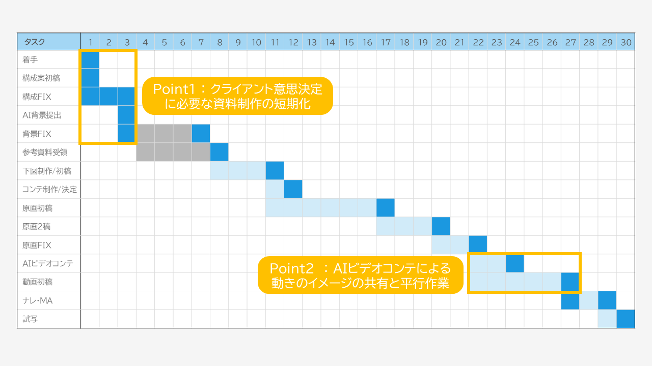 今回のCM制作では、通常60営業日以上かかる制作工程を30営業日に短縮することを実現しました。工程表を振り返ると、スマービーAIの活用によって、どの段階で制作が効率化されたのかが明確になります。