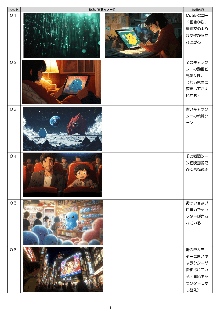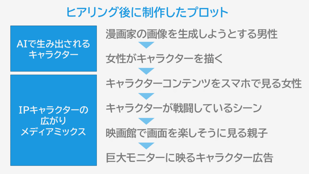 です。また、生成AIでは複雑なキャラクターデザインを一貫して再現するのが難しいため、特徴的なアイコンを決めておくと、キャラクターの統一感が出やすくなります。このヒアリングで登場人物の特徴を整理します。AIの特性上、再現が難しいシーンやキャラクター造形もあるため、どこまで許容できるのか、もしくは制作を中断するかを判断します。