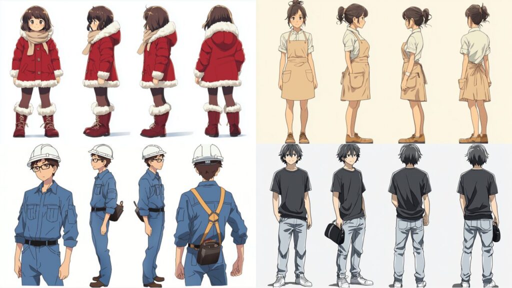 キャラクターシートでは、正面・横・後ろ向きなど、異なるアングルのバリエーションや、立ち姿・座り姿・歩いている動作など、基本的な動きを同一キャラクターで生成します。このとき、具体的な資料写真を活用することで、キャラクターのビジュアルを想定されるイメージに近づけることができます。特に、特定の職業や時代背景を持つキャラクターの場合、