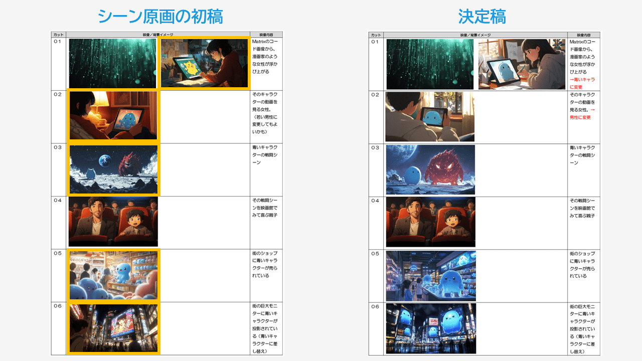 認識のズレが大きい場合は、テキストコンテ(プロット)の書き直しや、シーン原画を再出力しレビューを行い修正